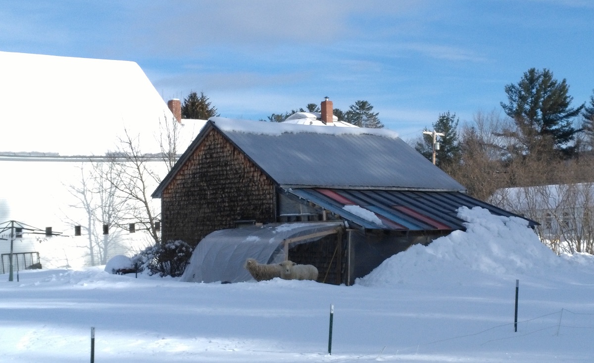 The hoop-shed I built for the sheep is holding up even in the face of the wind that barrels down off Mount Abram to the west of us; it sweeps across the field to pummel the backside of my buildings here. There was one super-frigid night when the wind was so intense that it whipped around the entrance of the shed and was blowing snow into the interior, which prompted me to provide the girls with a “door”. As expected, I do find myself having to manage this little shed for snow, but it’ll hold a good 8-10 inches of heavy, wet snow without buckling─some sagging, yes─but she doesn’t give in (kinda like me, lol!).