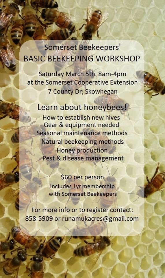 I’ll be at the Somerset County Cooperative Extension in Skowhegan this Saturday giving my annual bee-school. This will be my 5th year teaching the course as president of the Somerset Beekeepers and I’m looking forward to spending a day talking with folks about bees.
