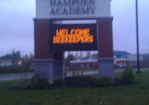 Upon arrival I was put to work inducting the numerous raffle items alongside several other beekeepers–mostly from the Penobscot and Penquis chapters of the MSBA. Donations of smokers, hive components, bee-themed oven-mits and baby costumes, numerous beekeeping-related books and magazines, entire hive set-ups, packages of bees to be picked up in 2015, beekeeping gear, and even a shiny new extractor–were all lined up on a series of tables along one wall of the cafeteria. The halls were fairly buzzing with excitement and enthusiasm.