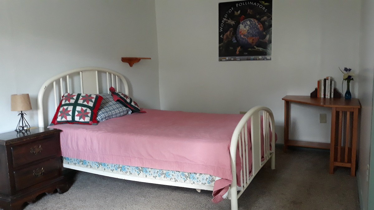 A newer, first-floor bedroom rather separate from the main house, but still readily accessible to the bathroom and other common areas. The room has been repainted to brighten the space, and decorated in what I hope comes across as “farm-like”, with an old quilt, handmade quilted pillows, and original Common Ground Fair posters given to me by a former colleague at Johnny’s (thank you, Tom!).