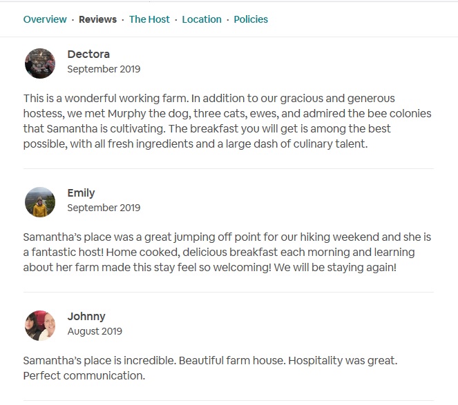 Anyone who is using AirBnB is comfortable going into someone else’s house or property for a stay. AirBnB has done a good job with their review-system too. Both the hosts and the guests have reviews, so hosts like me can screen potential guests before we decide if we want to accept their reservation. Everyone who has come to Runamuk since I began hosting in August, has been amiable enough, and I’ve had some interesting conversations with some fascinating people that I would not otherwise have met.