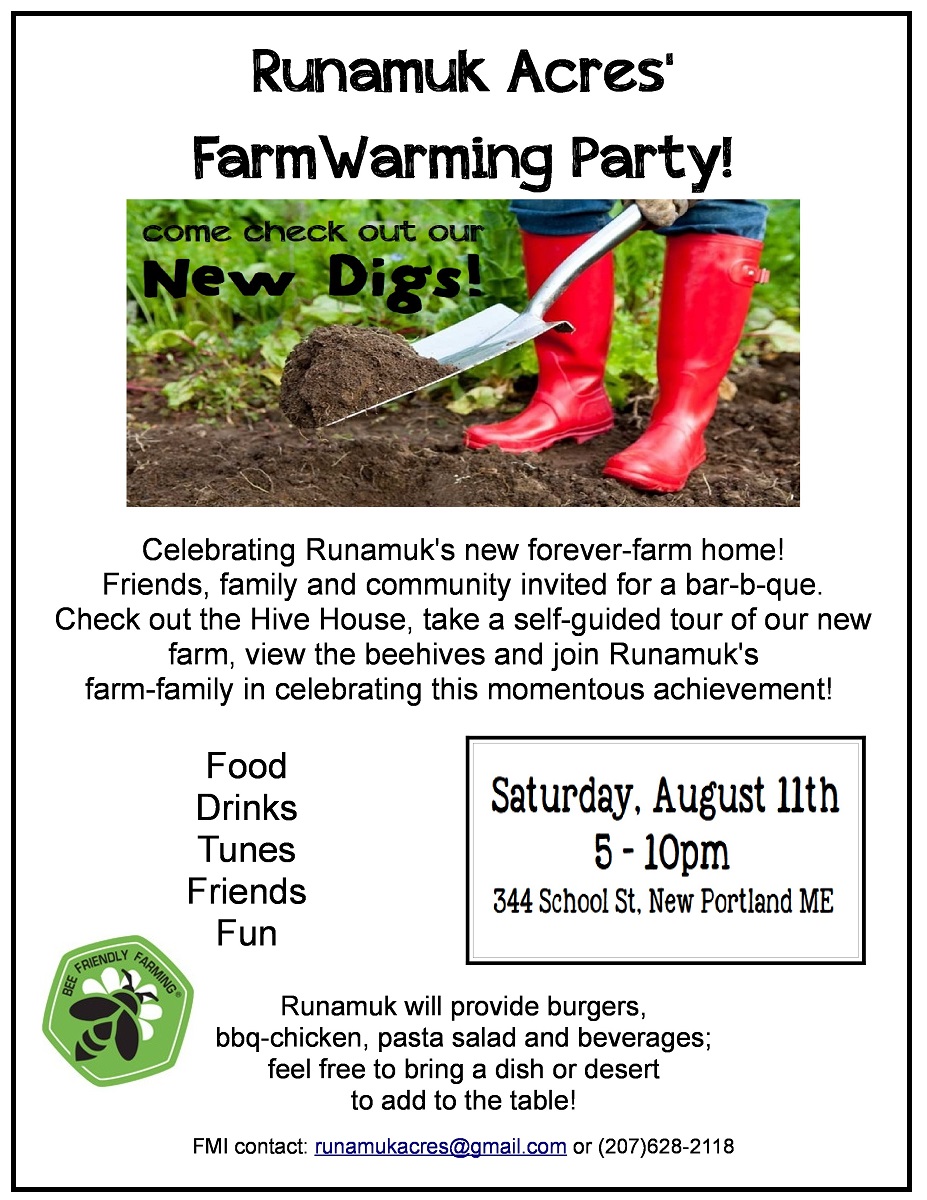 I want to share my joy and celebrate this victory with everyone who has ever supported Runamuk─and me─and so I’ve decided to throw a big “FarmWarming” party here on Saturday, August 11th. Family, friends, and the spectrum of community that has supported Runamuk over the last decade are all invited to come check out our new digs, share some good food with some great people, (I’m betting I’ll be able to wrangle a few musicians to play for us too!) and celebrate this momentous achievement with me.