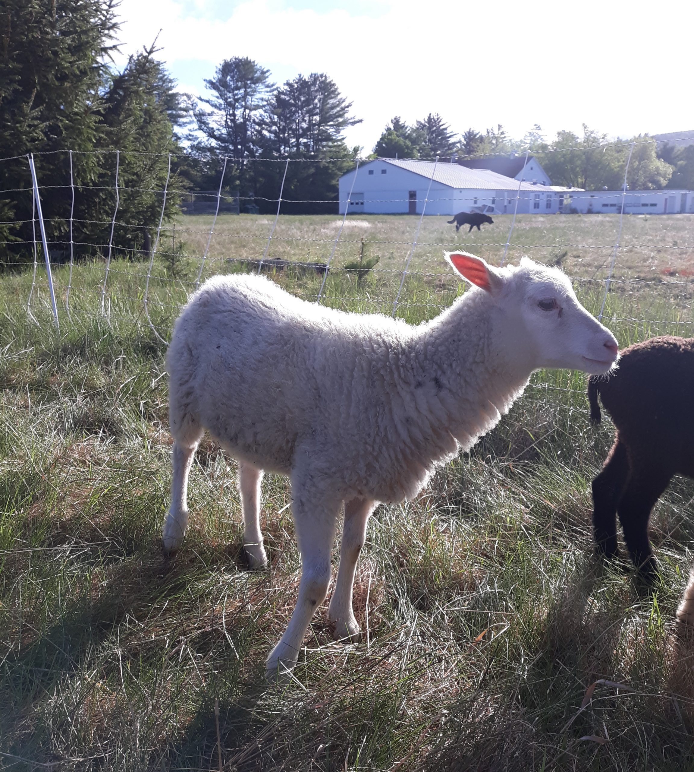 Pam met me at the busy farmstand and led me to the backside of their farm’s property. The pastures at Olde Haven stretch out behind their high-tunnels, all surrounded by the Maine forest. The newly weaned lambs sprawled en masse in the shade under a tall tree, and Jack, the Great Pyrenees, monitored the situation. A trio of small lambs came crying to the fence at the sight of us.