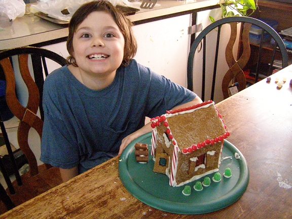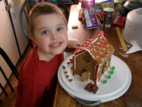 Summer with his Gingerbread House. FYI–the little brown chocolate covered raisins are supposed to represent a trail of reindeer poops.