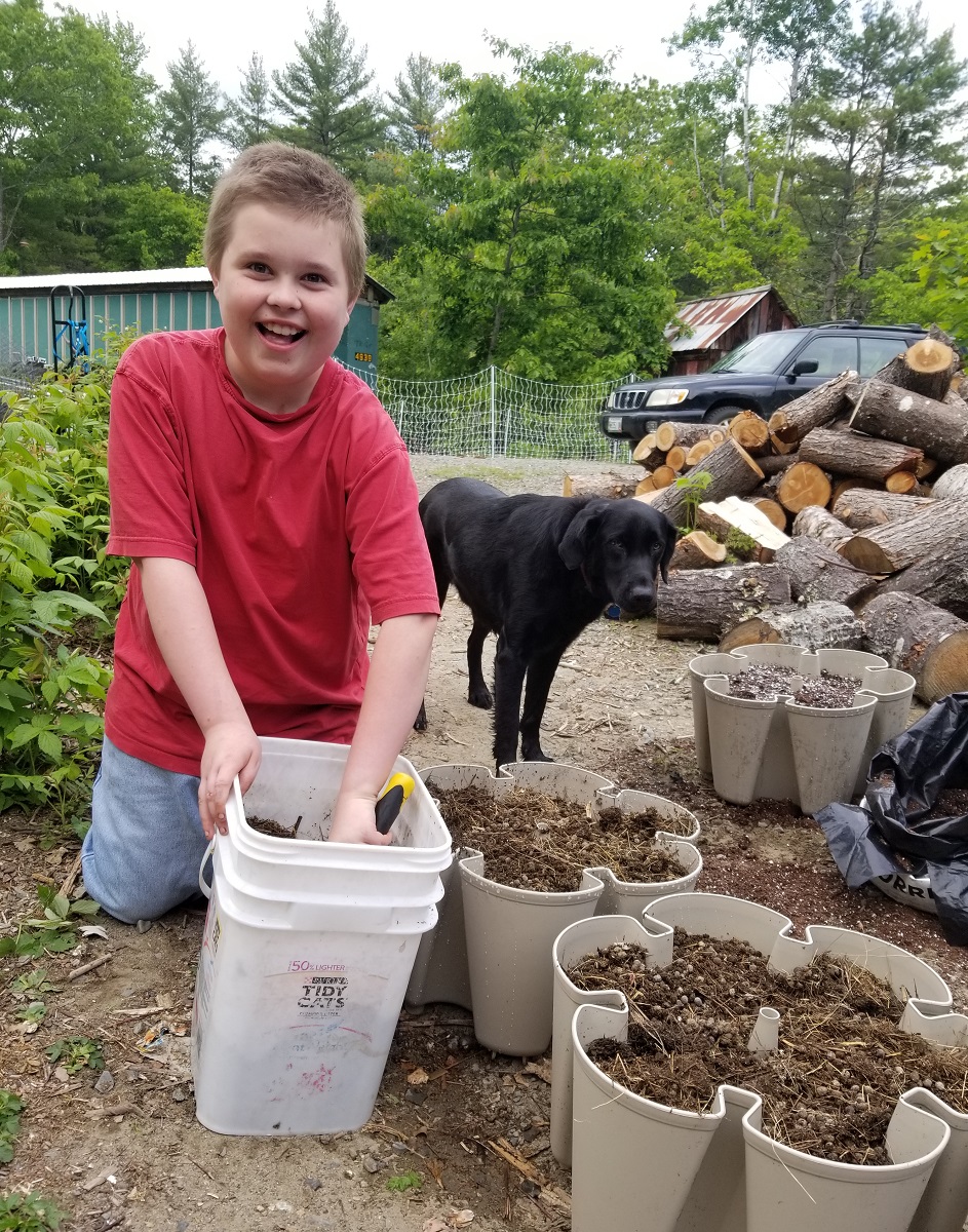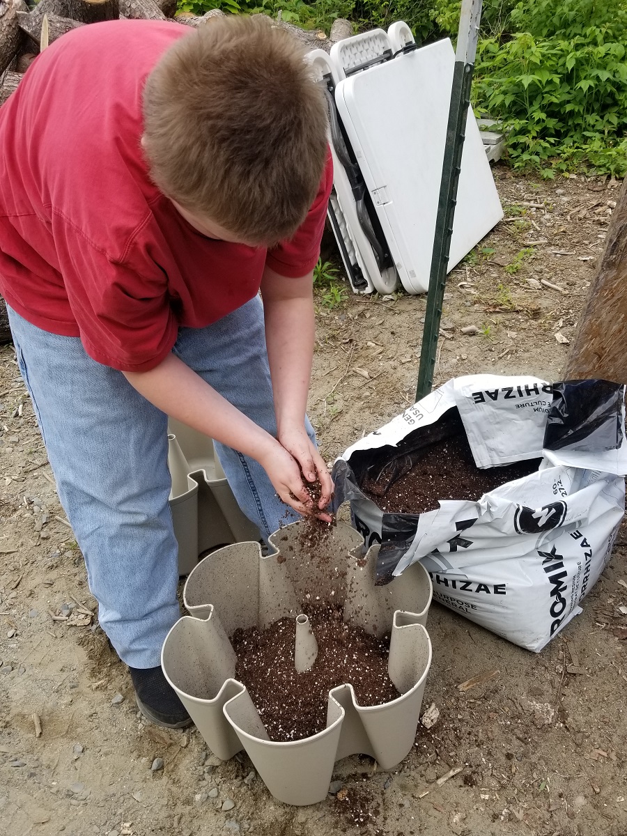 Using the GreenStalk is super easy. Together BraeTek and I filled the 4 tiers with potting mix─as a rule I use “ProMix”, which I buy annually as a bale at my local Campbell’s True Value hardware and garden center in Madison, Maine. It’s a mix of peat moss, vermiculite and mycorrhyzae that has always served me well.