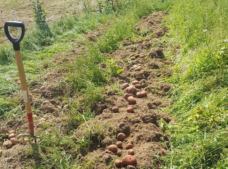 Harvest your crop using a spading fork and lifting the entire root system out of the soil. Try to avoid spearing too many of your spuds, and handle the fresh potatoes carefully to avoid tearing their skins, which are delicate at this stage. Potatoes that accidentally get pierced or cut in the harvesting should be eaten first.