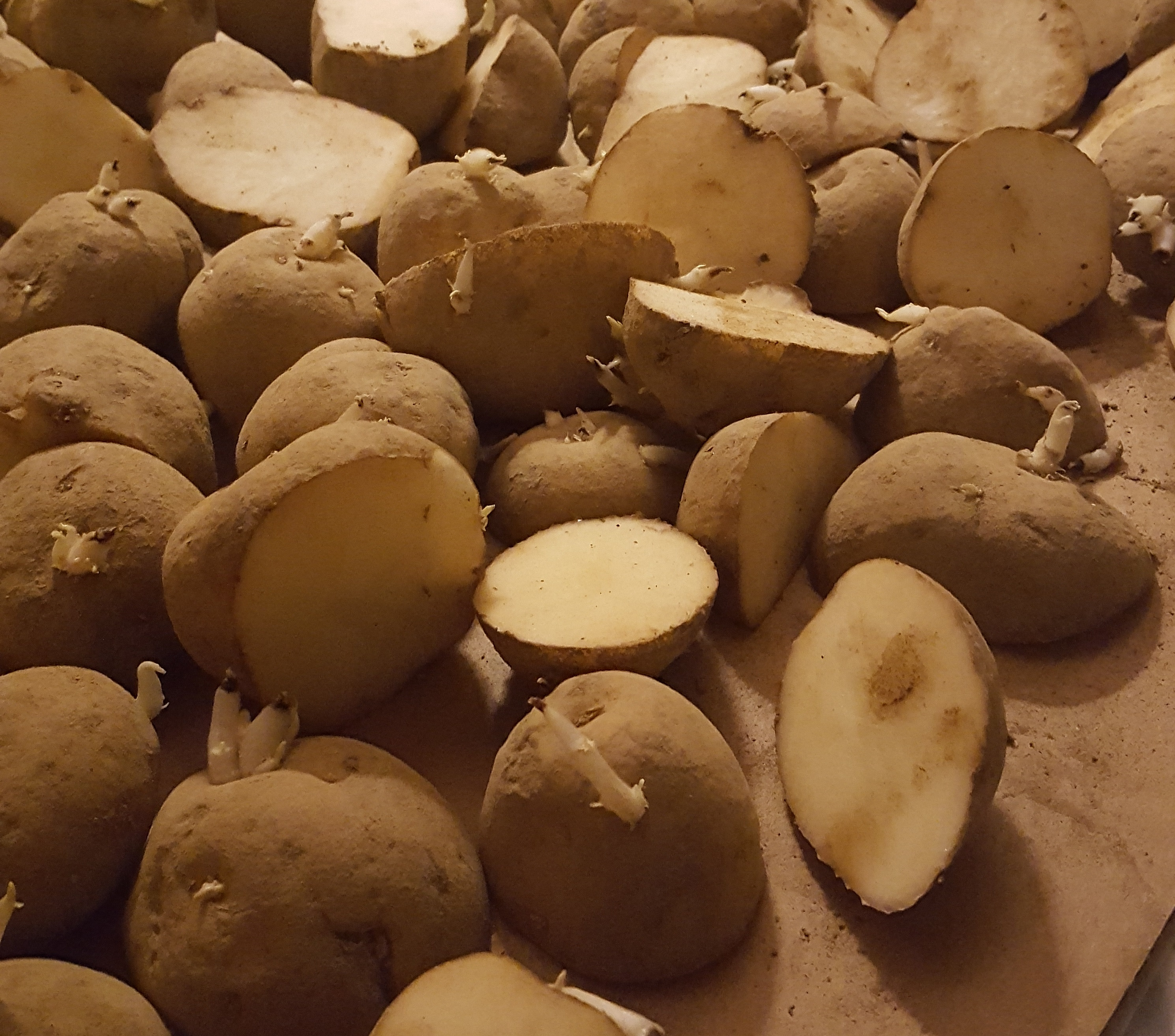 Potatoes are grown from potatoes, not from seed as with most other crops in the garden. The spuds intended for growing are kept in a state of dormancy until the planting season draws nigh, then they are brought out of refrigeration and allowed to start sprouting. Those eyes you pick and peel away from your taters when preparing dinner? Those are what become your potato plants.
