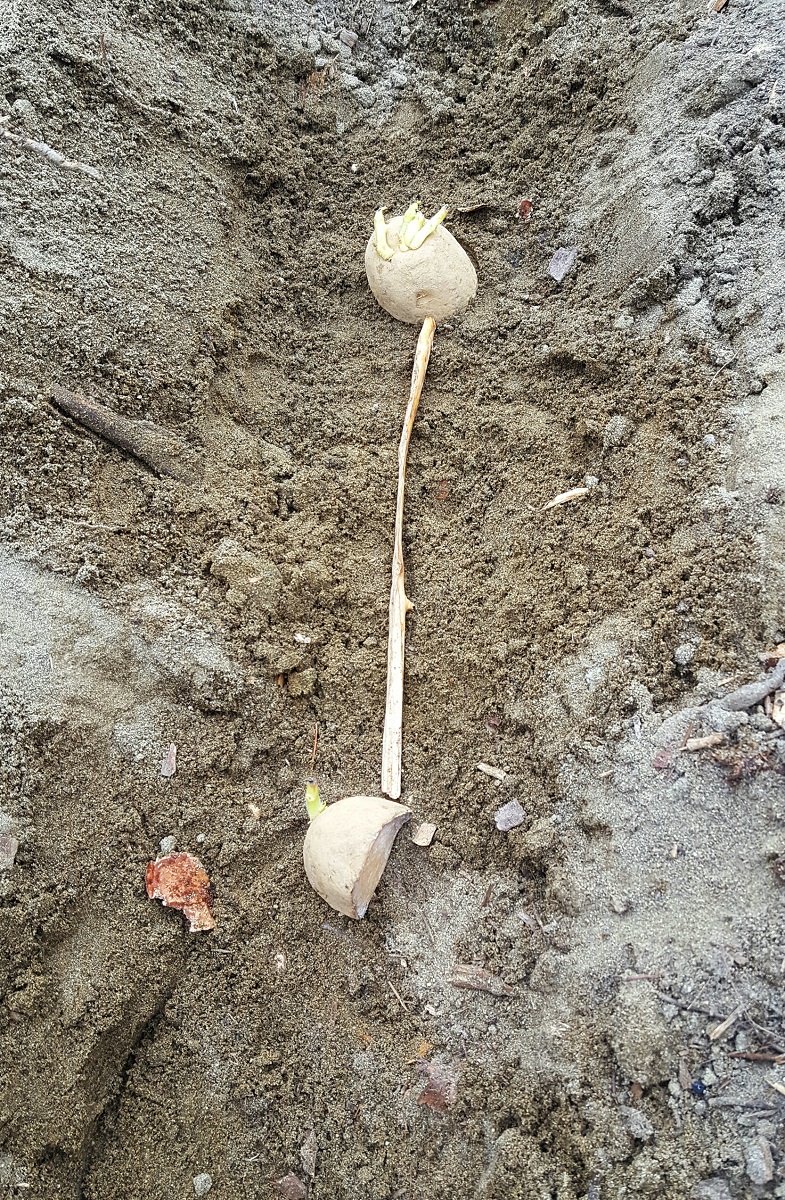 Standing on one side of your trench, use your hoe to pull the mounded soil from the opposite side of the trench onto the seed potatoes. Ideally you’ll be covering them with about 6-inches of material. For now, leave the mounded soil on the second side of the trench for hilling later on.