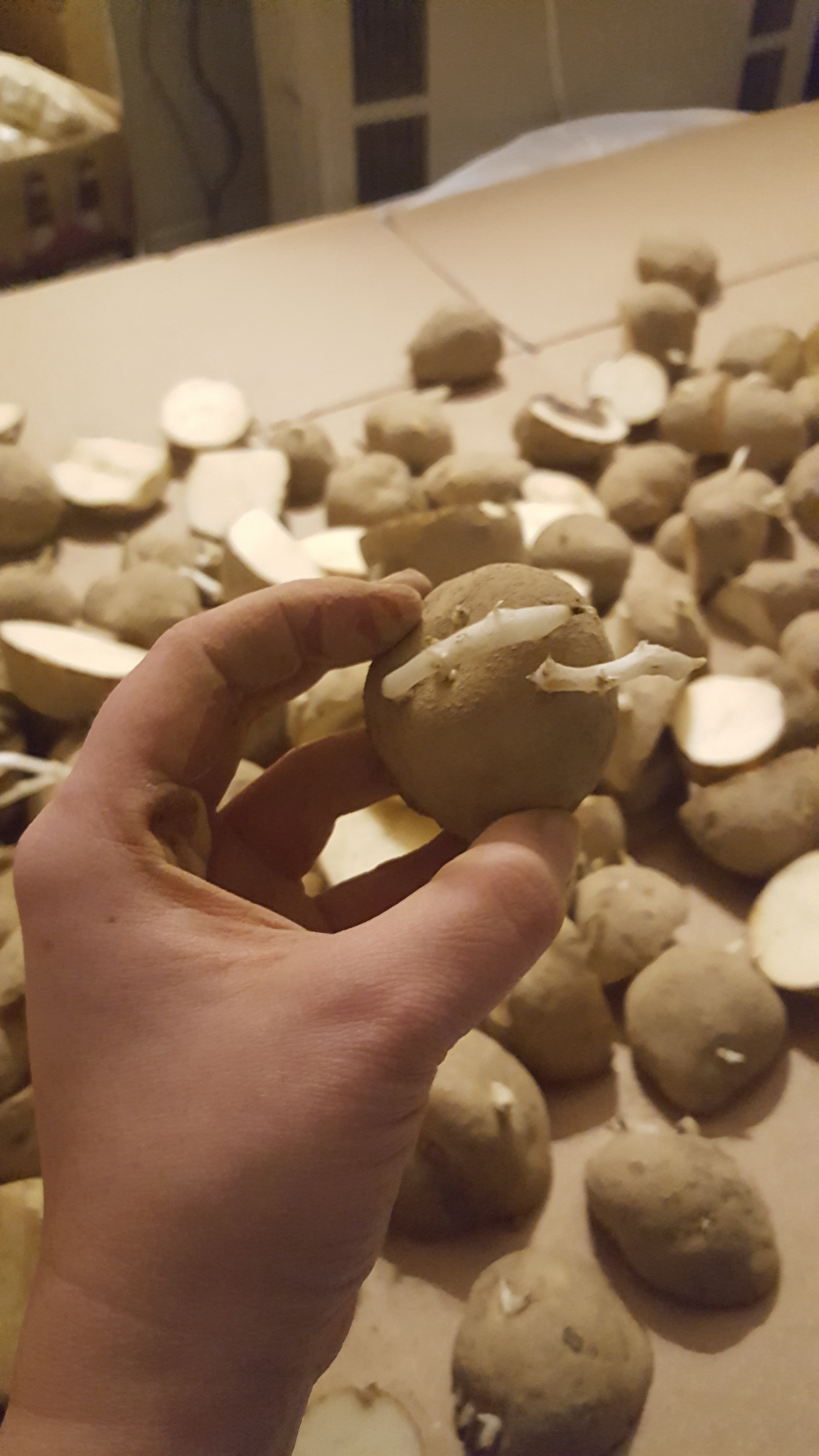 Essentially chitting is pre-sprouting your seed potatoes. In my experience this has already happened by the time you receive your seed-potatoes, so you shouldn’t have to worry about it. However, on the off chance that you were to get your hands on some un-sprouted spuds, all you would need to do is lay the tubers out in a spot that is 50-degrees and sunny. The eyes will begin to sprout, and once they have reached 3/4 to and inch long they are ready.