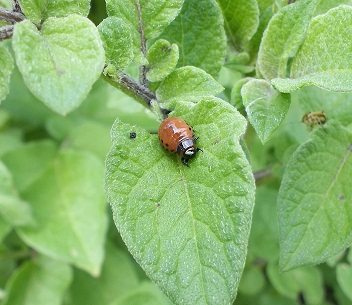 Vigilant home gardeners can watch for the beetles and handpick them, drowning them in soapy water. Watch for yellow-orange eggs on the underside of potato leaves─usually laid in batches of 30. Eliminate the eggs by squishing them or scraping them away with your thumb-nail, or just tear that piece of the leaf off and crush it under the heel of your shoe. If you miss some eggs and find larvae eating your plants, pick these off and either feed them to your chickens or drown the larvae in soapy water.