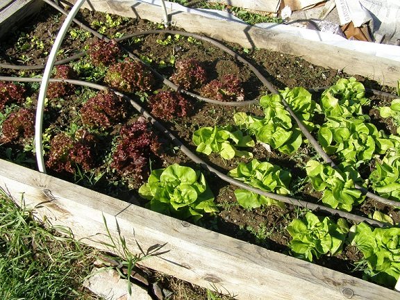 These are the lettuces I planted a few weeks back. They’re looking really great. Here you can see the soaker hose I’d laid in this bed for the day, to give everything a good watering. And if you look closely, you can see the new lettuce sprouts I planted between these heads to ensure a successive harvest. We love our leafy greens!