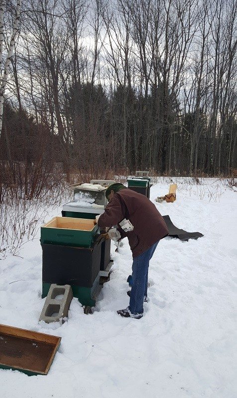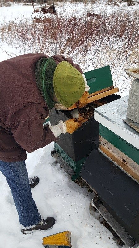 The really big news is that I’ve ordered 10 more nucleus colonies for May and June pick-up from my favorite local beekeeper, a kermudgeony old silver-haired beekeeper with a fantastic bushy mustache and a stern glint in his eye. What’s more, temperatures were mild today so I took the opportunity to perform my January hive-checks. I am over the moon to share that 5 out of 5 hives were alive and looking strong. With the warm fall we experienced here in Maine I’ve been anxious about the fate of my colonies; once you close them up for the winter there’s nothing you can do but hope for the best. The sugar-cakes I had added just after Thanksgiving were not completely gone yet, but I added more sugar to each hive before I closed them up again. We’ll check them again in February, hoping for the best─that each of these hives make it through to the spring and we can continue to grow the Runamuk apiary.