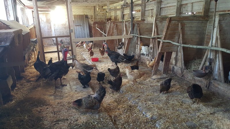 I bought a few two-by-fours, scavenged doors and hardware from around the farm, and my partner and I proceeded to divide the south-facing milking room into 3 sections simply by erecting walls of chicken wire. The back two “rooms” were suddenly chicken coops with the addition of roosts–saplings we cut from the forest and screwed across the tops of the cow-stalls. We brought the nesting boxes from the hoop-coop and moved our chickens into the barn under the cover of night. The new laying hens, turkeys and the goose arrived about a week later and we moved them into the second coop. I hope that the third space we created will house sheep next winter, but for now it is just storage space.