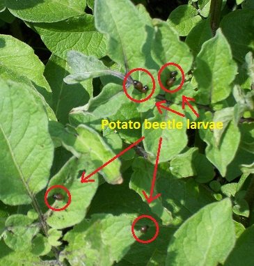 These are the larvae of the Colorado Potato Beetle–check out that link for more info. ….apparently they’ll go through four moultings before they look like their parents–the domed-shelled yellow and black striped beetles. Before that they look like this–soft-shelled, slug-like larvae. Really rather revolting–and this coming from someone who appreciates the larvae form of Apis mellifera (the European honeybee)–please note, I said “appreciates” not “finds adorable”. Somehow, insect larvae does not pass all boundaries of maternal instinct. Still, even the larvae of the potato beetle is a living being, and it is difficult for me to take the life of any living thing–but a necessary fact of this circle of life. I gotta feed my family.
