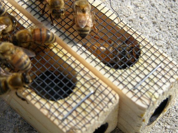 I affixed the Queen-cages to a frame in the lower brood box simply by pressing it into the comb (screen-side facing out so that the workers may tend Her) and put the hive back together. The workers would eat through the marshmallow fluff that plugged the opening of the cage, and–so long as nothing goes wrong–She would be released and commence laying.