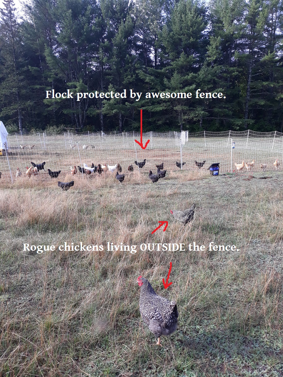 Somewhat belatedly, I realized that I’m rather like my rogue chickens─who are happier risking their lives outside the protection of the fence, than living with the rest of the flock inside it. That’s why I’m not happy with a regular job and regular hobbies like the vast majority of society; I’m a damned rogue chicken!!!