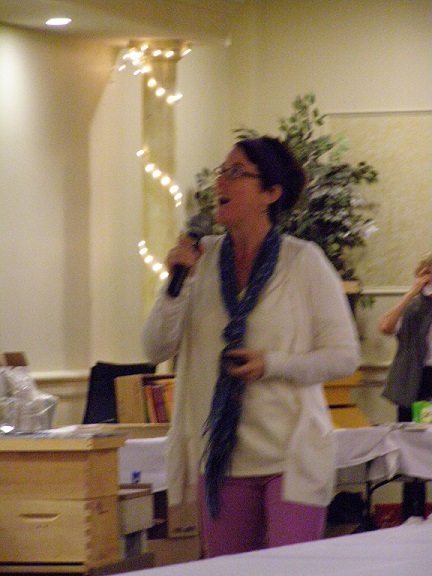 Deborah was energetic and enthusiastic–a “spunky speaker”–she talked about the problems the bee-industry is facing, the media attention that “Colony Collapse Disorder” has generated since 2007 and all of the doom and gloom reports–but wonders “is it helping?” She talked about some of the movies CCD has spurred and the numerous cartoons circulating facebook–most of which I myself have seen come through my newsfeed.
