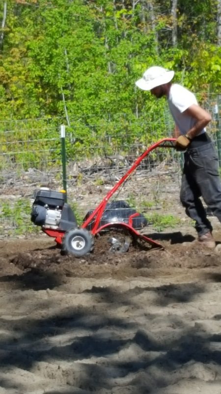 There are only a couple of patches of ground within our fenced garden area that were open enough for quick and dirty garden installation. Like the rest of this property the raspberry canes are thick, and debris from the cutting that was done litters the ground in the form of sticks, branches and stumps. In order to make full use of the space we’ll have to work hard to clear away the raspberries and saplings. A couple of goats would make short work of it, however I am not a goat farmer and I cannot justify the expenses associated with goat ownership at this time. Remember, I’m intentionally keeping my expenses to a minimum so that I can generate more of a profit from my farming endeavors. So Paul dutifully tilled the open patches of ground, stopping every few minutes because the roots of many raspberry plants had wrapped around the blades of the machine. When he was finished I laid out the beds, amended the sand with manure, planted and mulched-heavily.