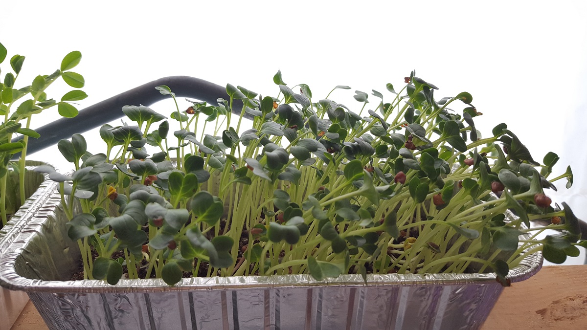 The majority of what I’ve sown has been the dwarf grey sugar pea seed I purchased from Johnny’s─at least 2 trays of this per week. I’ve also tried the daikon radish, the cressida cress, broccoli, Johnny’s mild micro mix, and the bull’s blood beet. Of these, the peas, radish and cress have performed best under the particular growing conditions I am able to offer─that being cold.