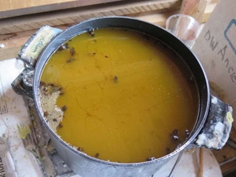 “One more tip guys: do not get a pan out of your wife’s kitchen.” Use old pans for processing your beeswax because no amount of scrubbing is going to take the wax off a good kettle. Tag sales, lawn sales, thrift stores, Good Will and Marden’s are all good places to look for a couple of old kettles for your beeswax projects. You should avoid using copper or iron pans though, as a reaction between your wax and those metals can discolor your wax.